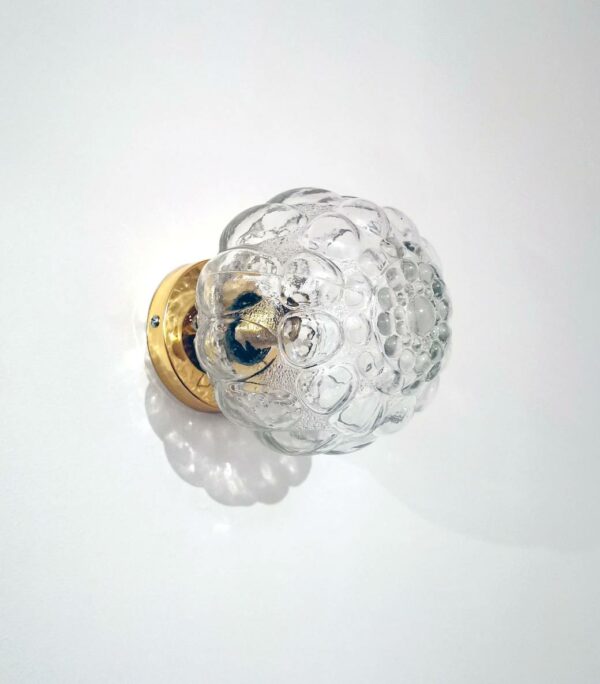 Elégante applique murale composée d’un globe en verre et d’un pavillon en métal doré. Un globe bullé des années 60 dans le style Helena Tynell, designeuse finlandaise.