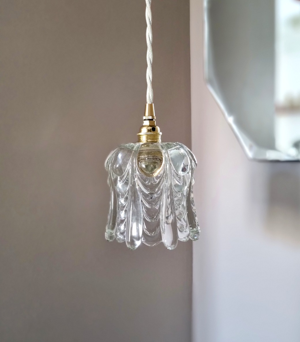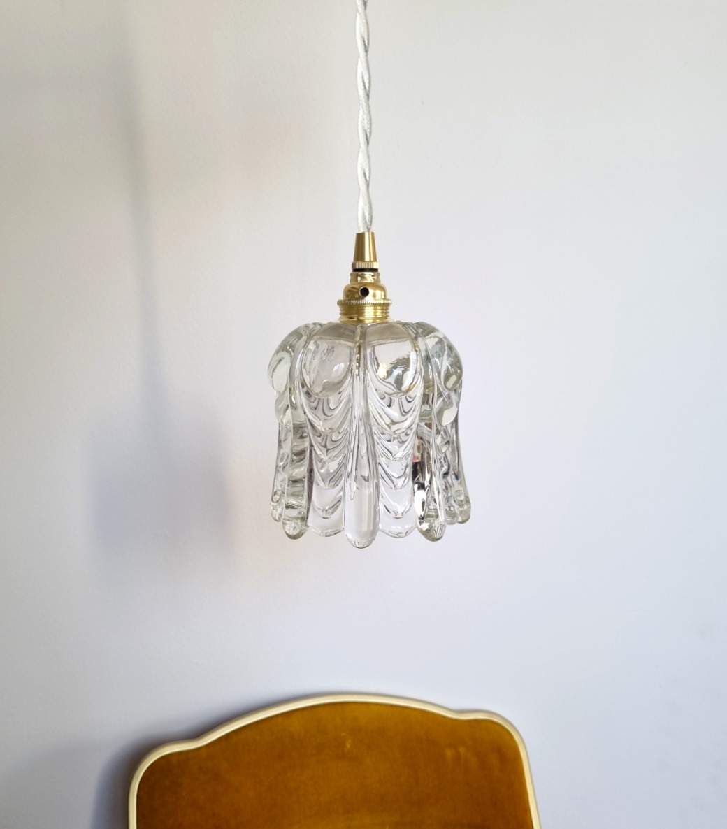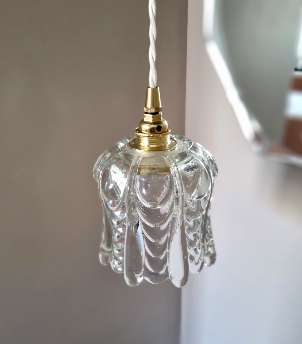 Elégante lampe baladeuse globe en verre épais style art nouveau. Une baladeuse vintage chic à suspendre en lampe de bureau ou lampe de chevet.