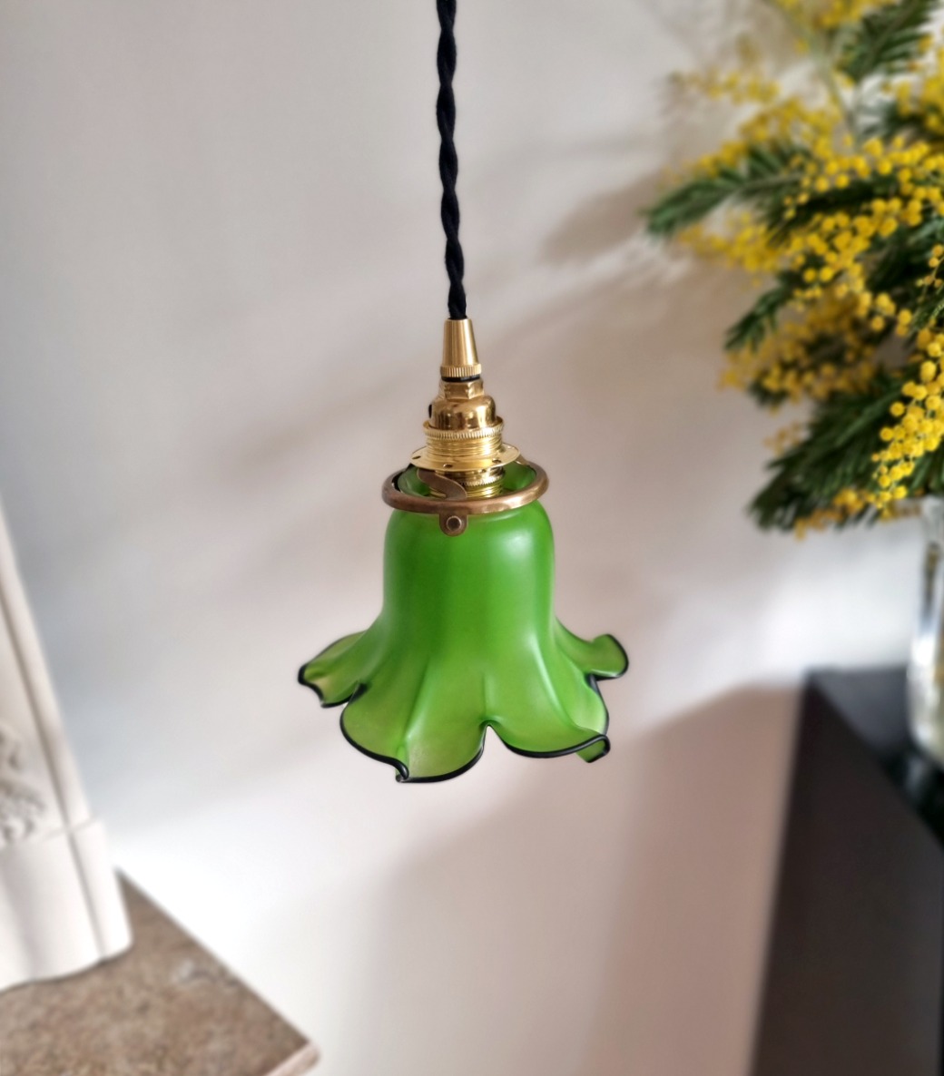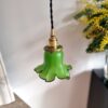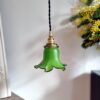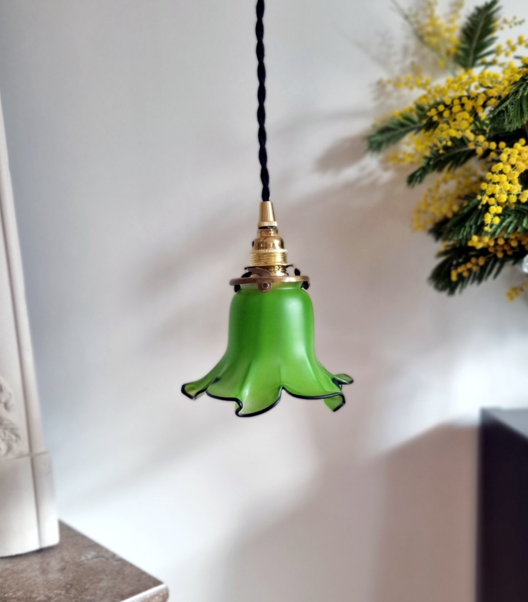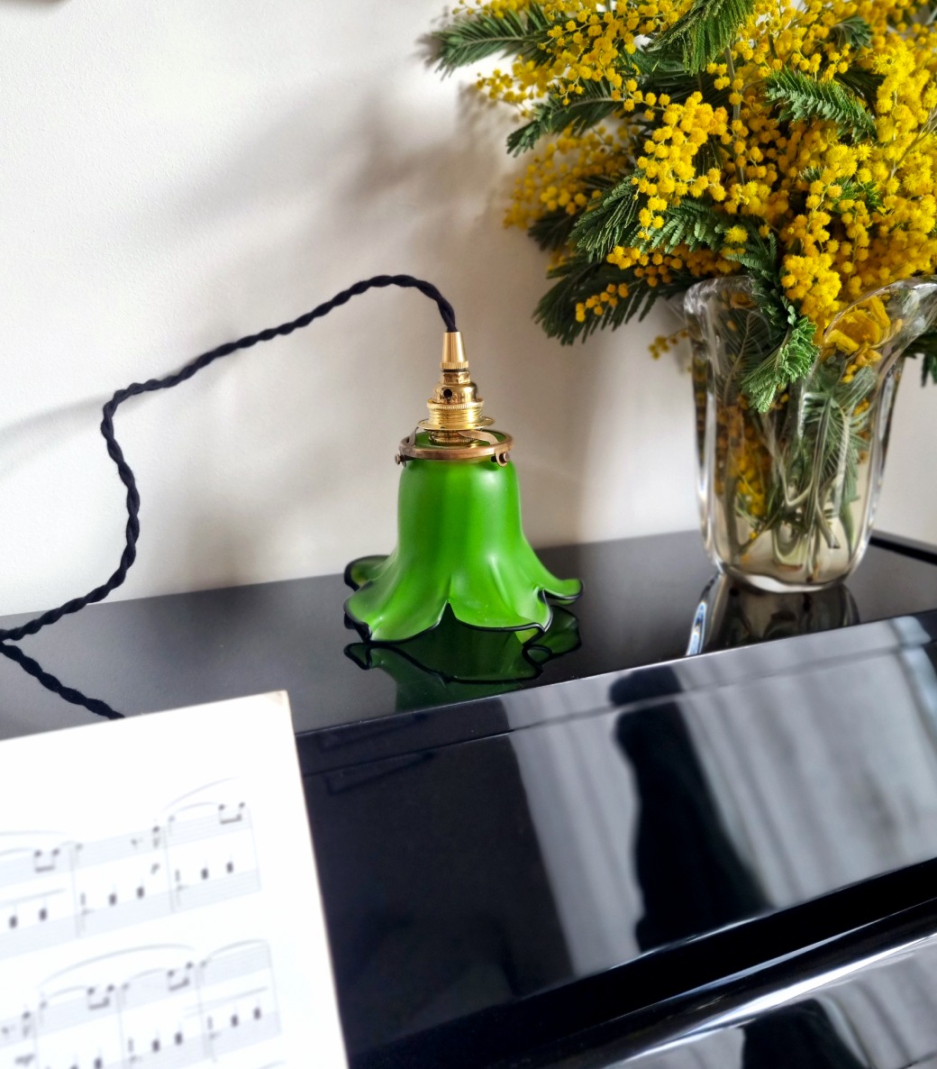 Lampe baladeuse tulipe verte style art déco et son cordon tressé noir ou doré. Une baladeuse qui donne du caractère tout en lumière !