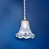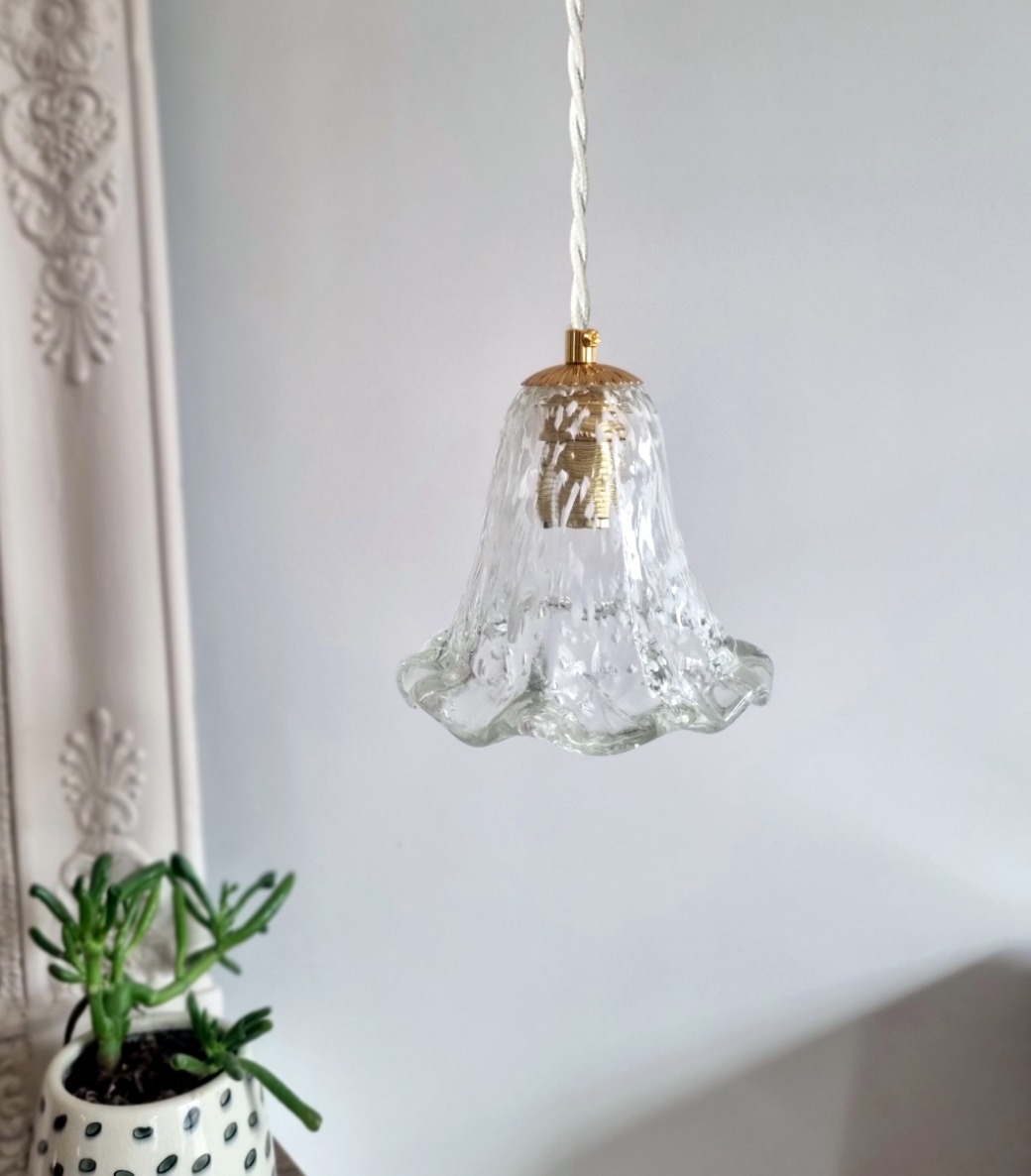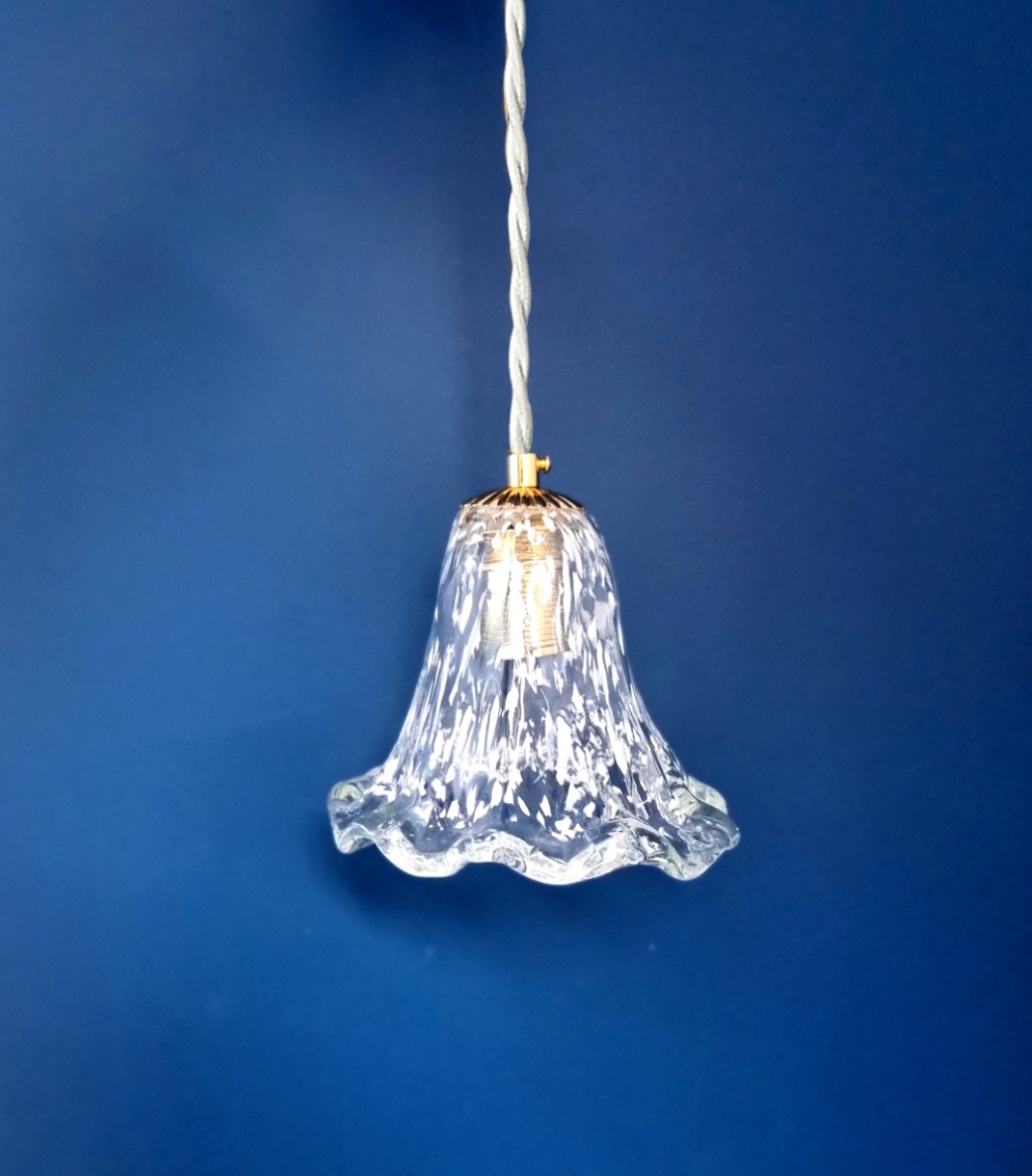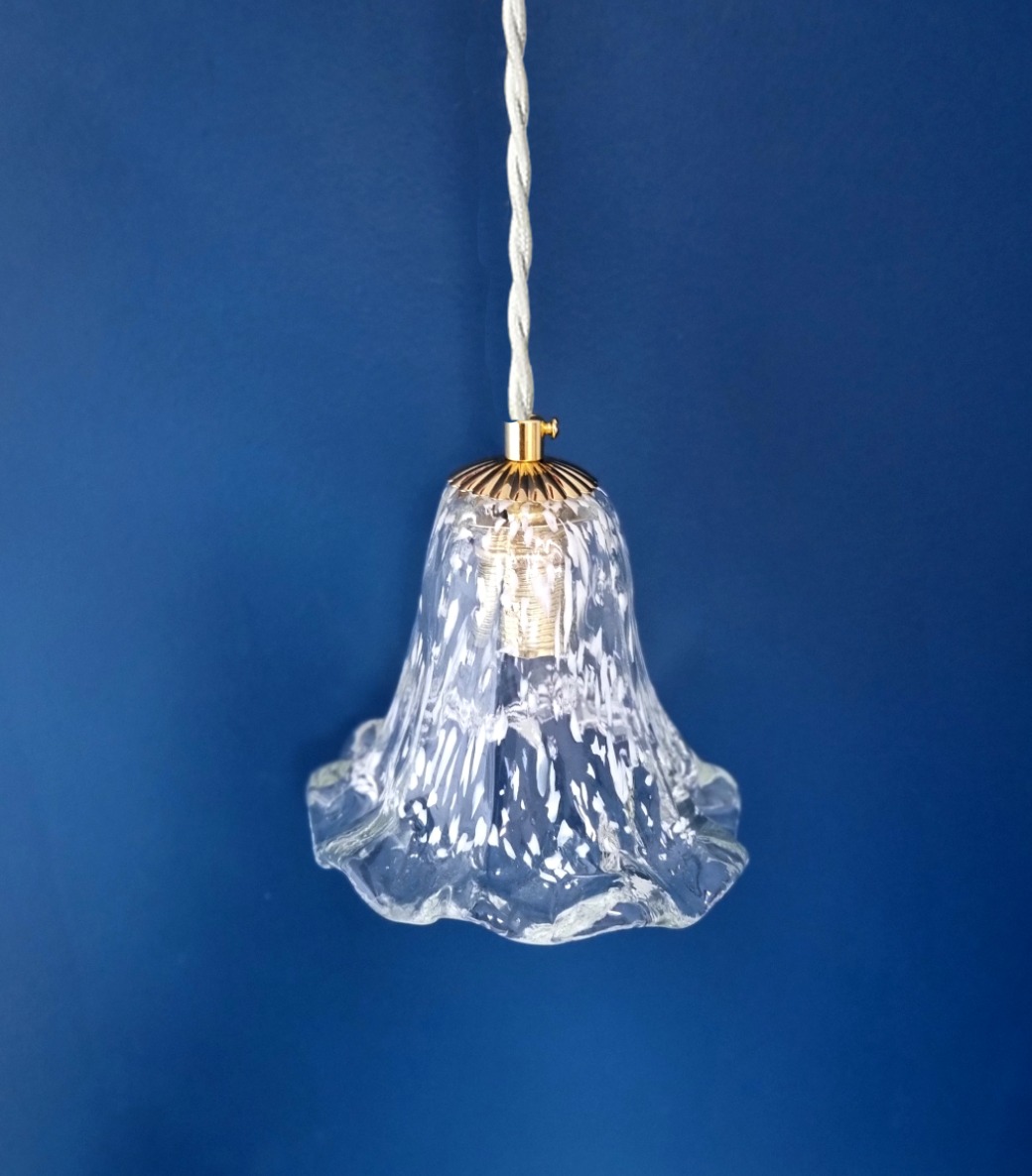 Lampe baladeuse tulipe en verre épais moucheté blanc style Murano. Une baladeuse vintage et poétique aux courbes aériennes !