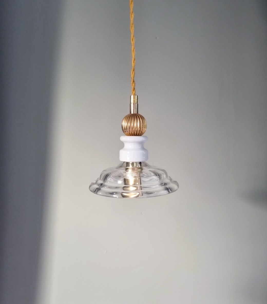 Elégante lampe baladeuse créée à partir de pièces anciennes en verre et porcelaine. Une baladeuse unique à suspendre en lampe de bureau ou en lampe de chevet.
