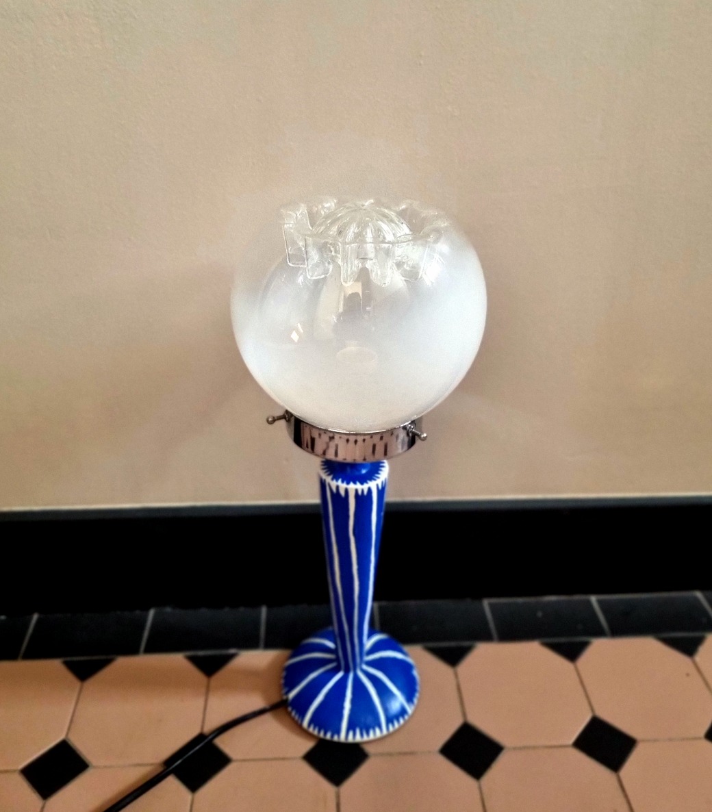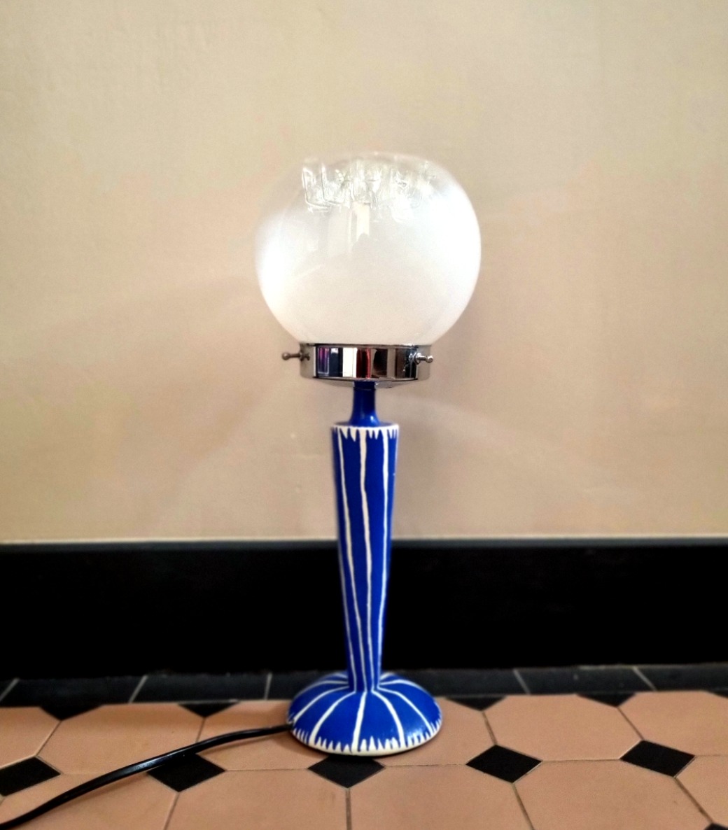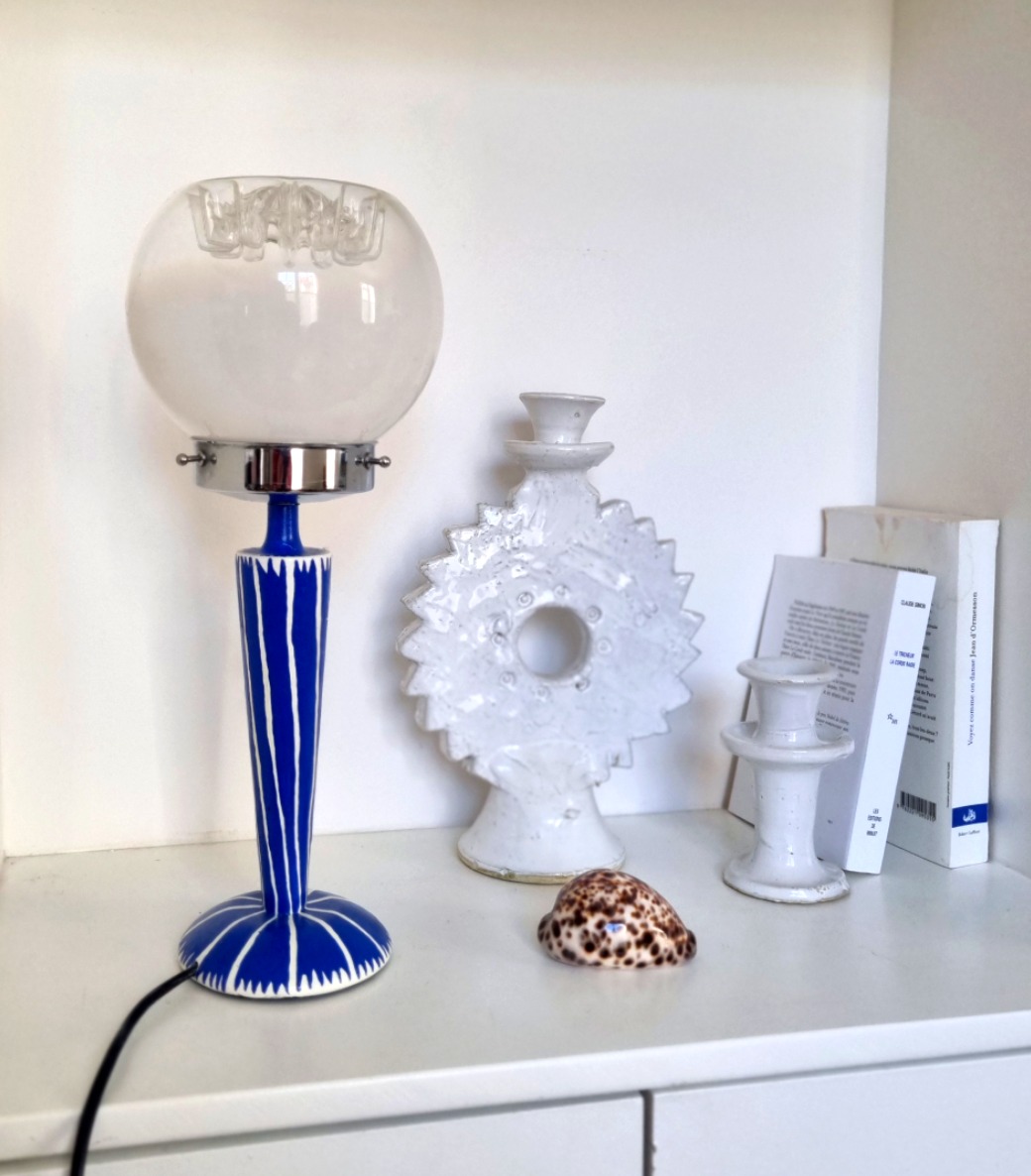 La lampe Ithaque est un véritable objet de décoration à l’esthétique graphique. A la fois élégante et colorée, elle mélange parfaitement les styles. Son design graphique inspiré des motifs amérindiens, a été peint à la main par Bloomis Studio. Son globe murano fumé a été chiné par Bloomis. Une création unique qui apportera vibrance et singularité à votre intérieur.