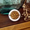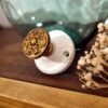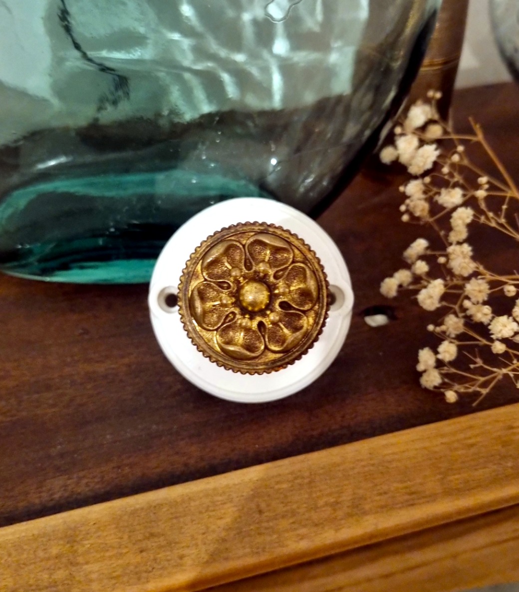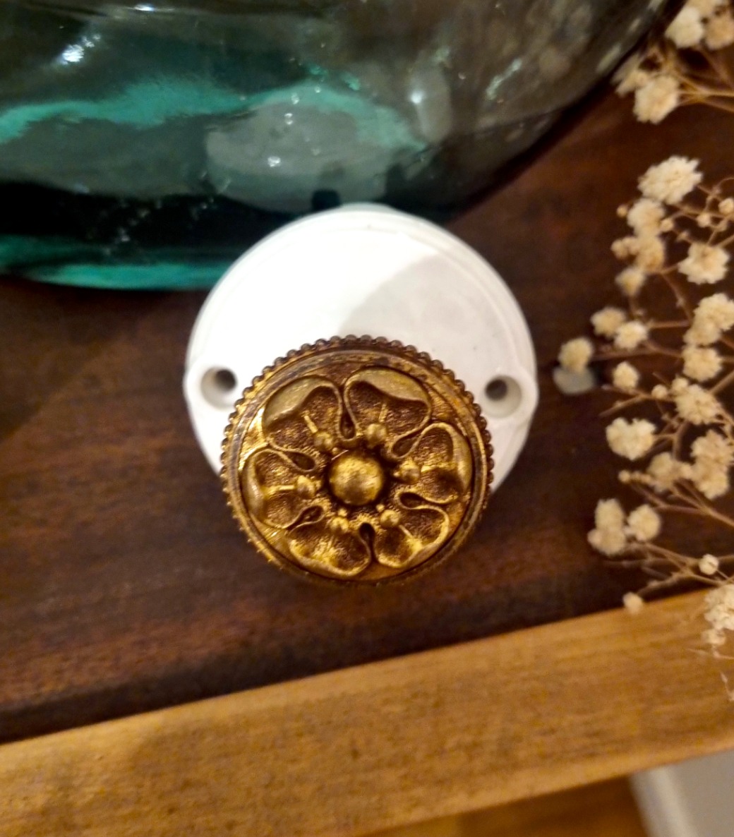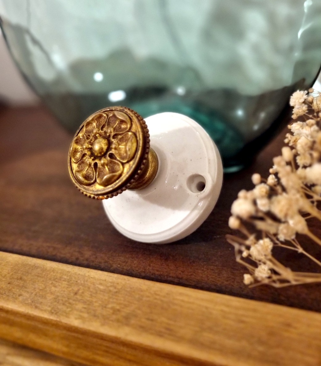 Patère murale en porcelaine et laiton pour suspendre votre lampe baladeuse le long d’un mur. On adore le motif floral de son bouton en laiton ! Une création décorative et upcycling, idéale pour éclairer un chevet ou un bureau.