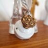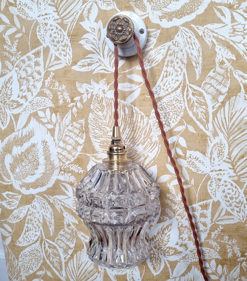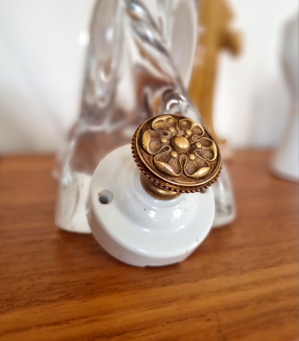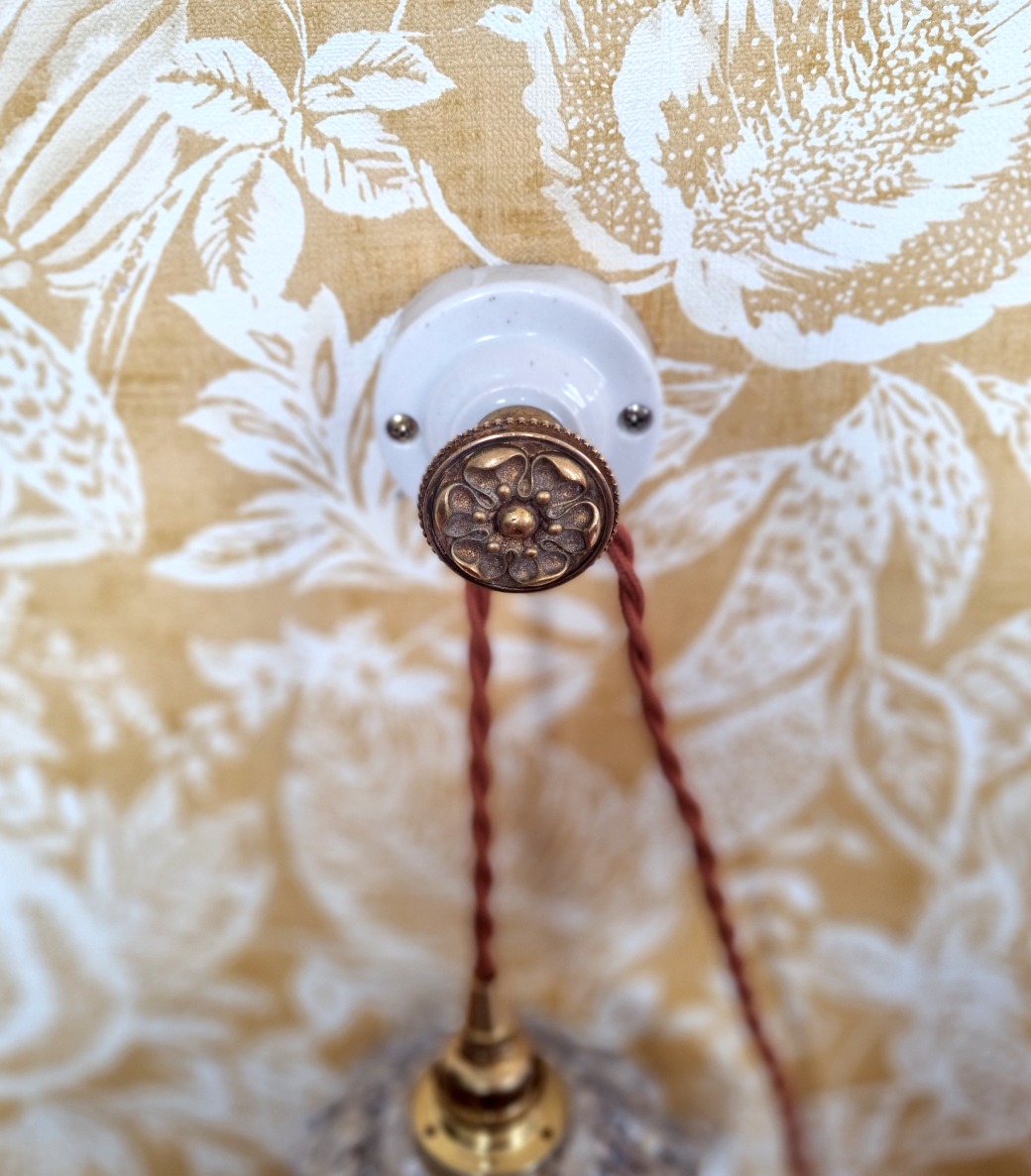 Patère en porcelaine et son bouton en laiton floral pour suspendre votre lampe baladeuse le long d’un mur avec style. Une création décorative et upcycling pour suspendre une lampe baladeuse où vous souhaitez !