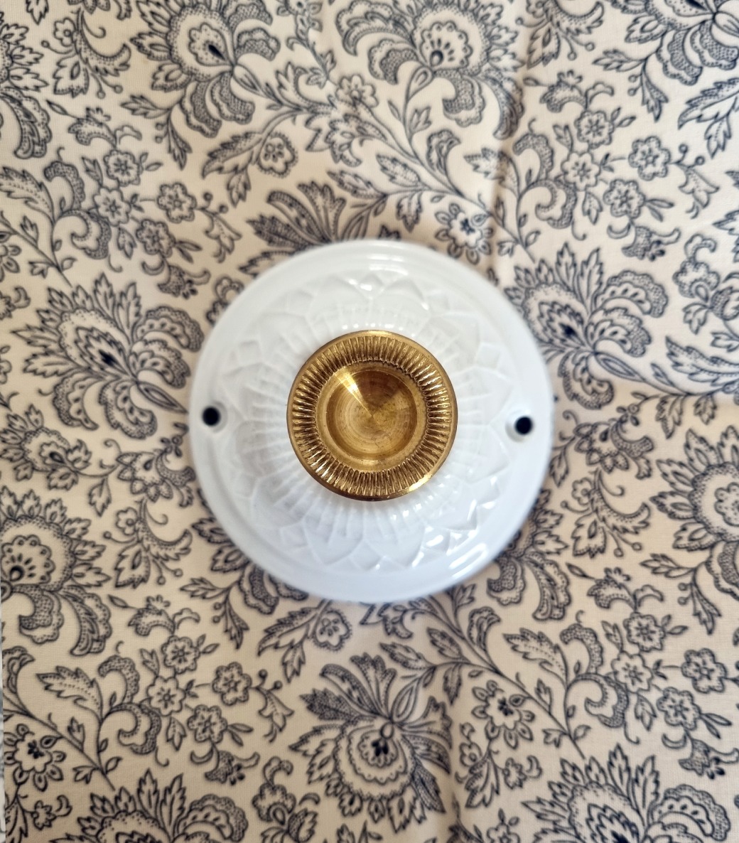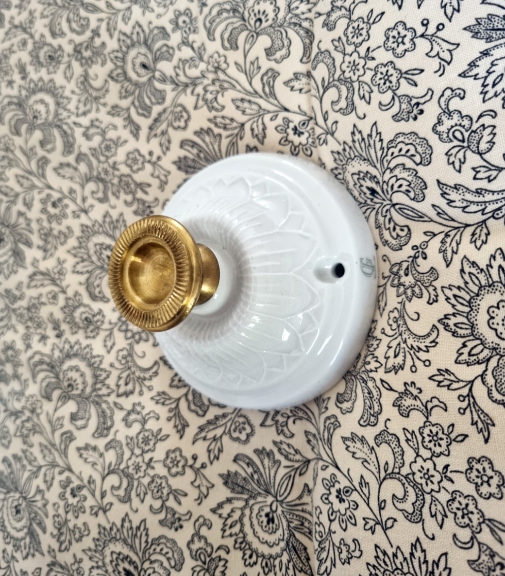 Patère en porcelaine et laiton pour suspendre votre lampe baladeuse le long d’un mur avec style. Une création upcycling pour apporter cachet et unicité à votre intérieur.