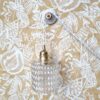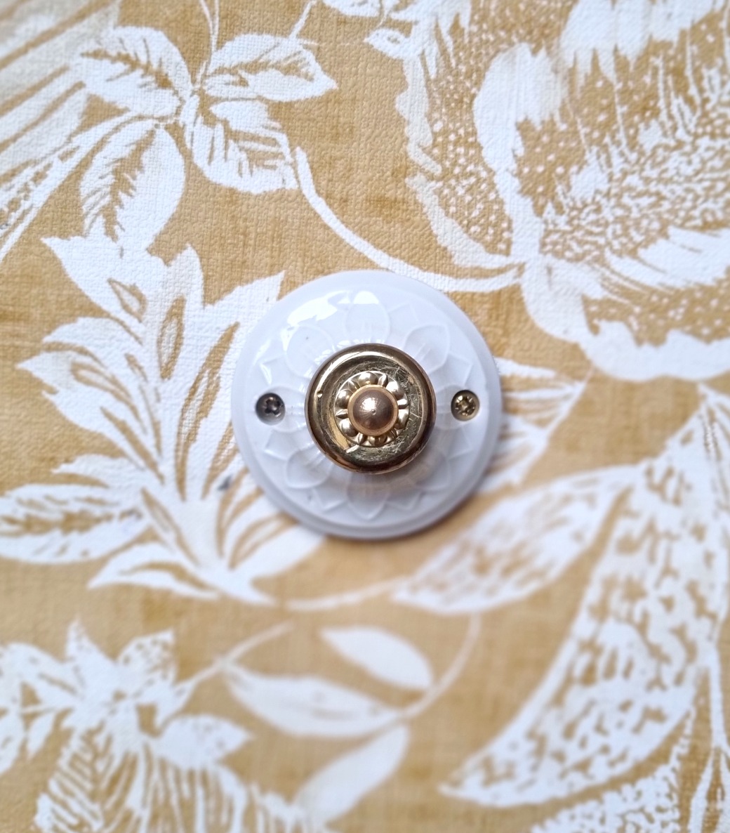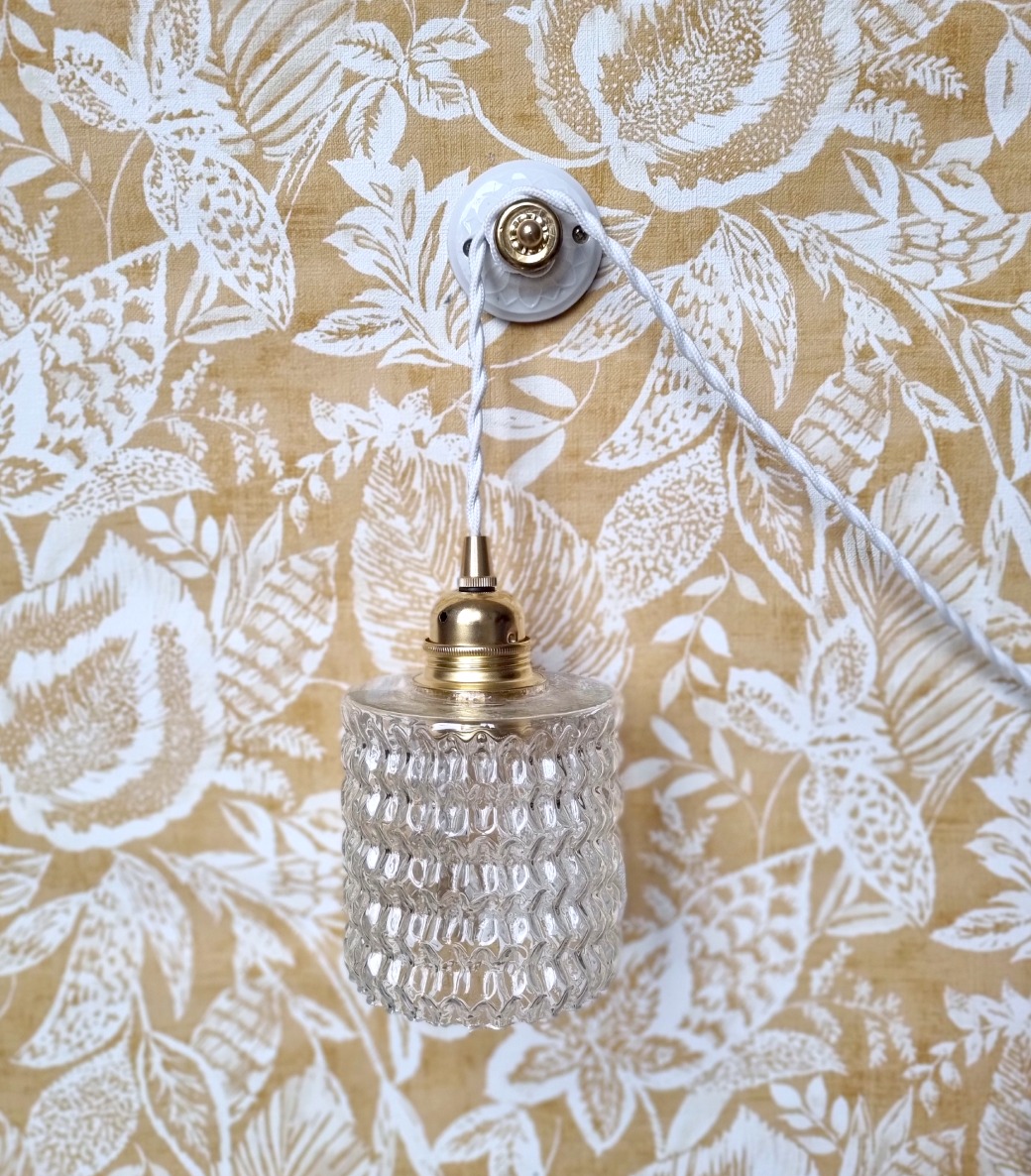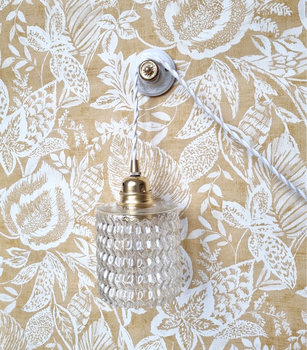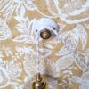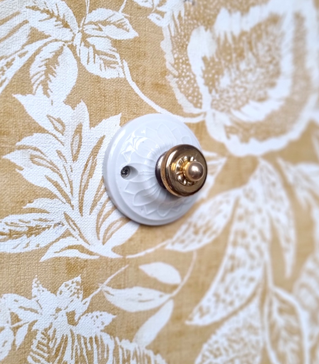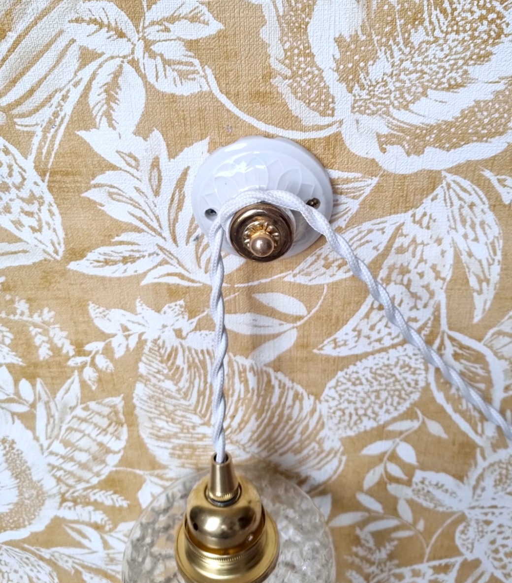 Patère rosace moulurée en porcelaine pour suspendre votre lampe baladeuse le long d’un mur avec style. Une création décorative et upcycling, idéale pour éclairer un chevet ou un bureau.