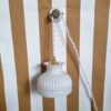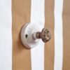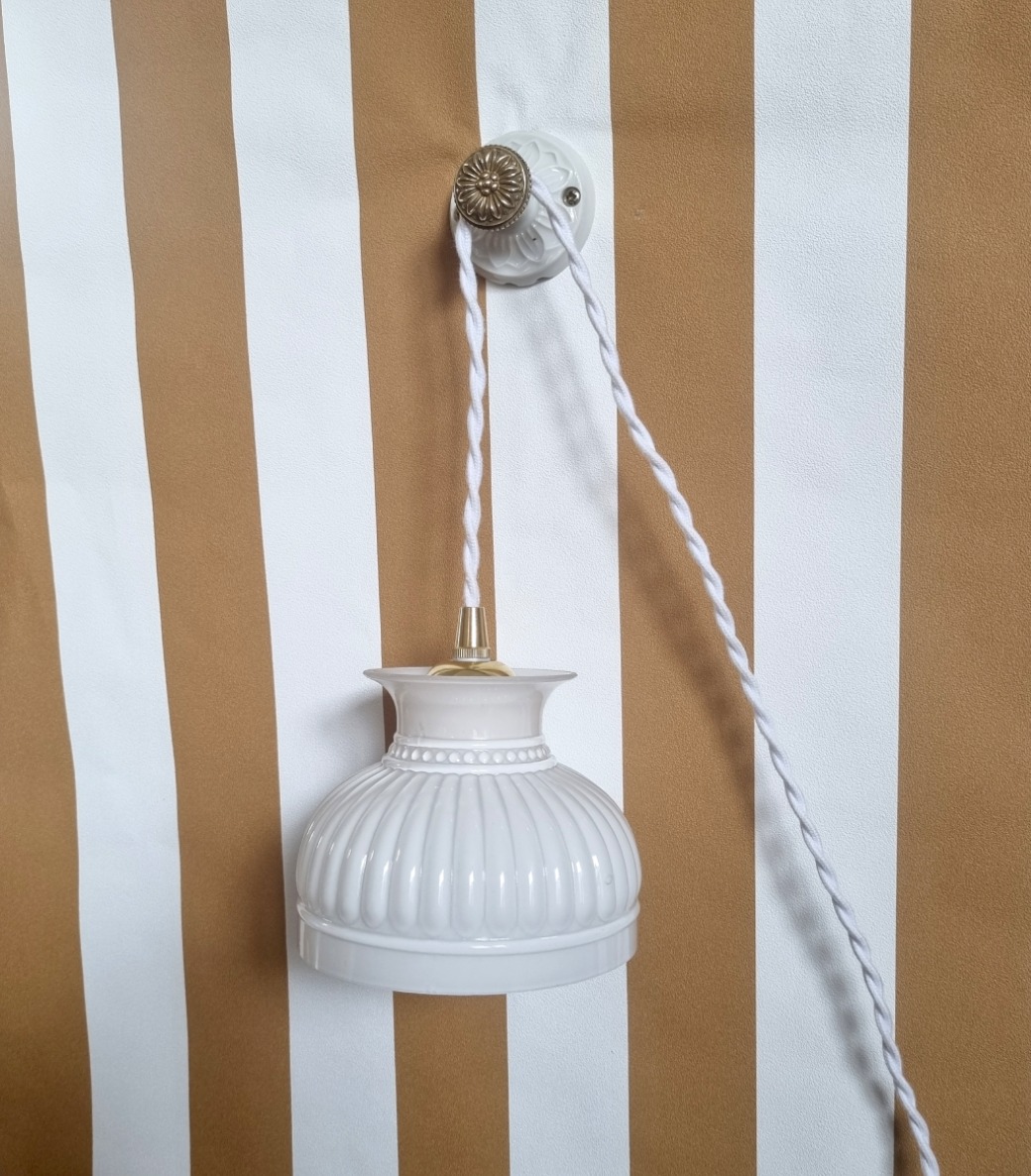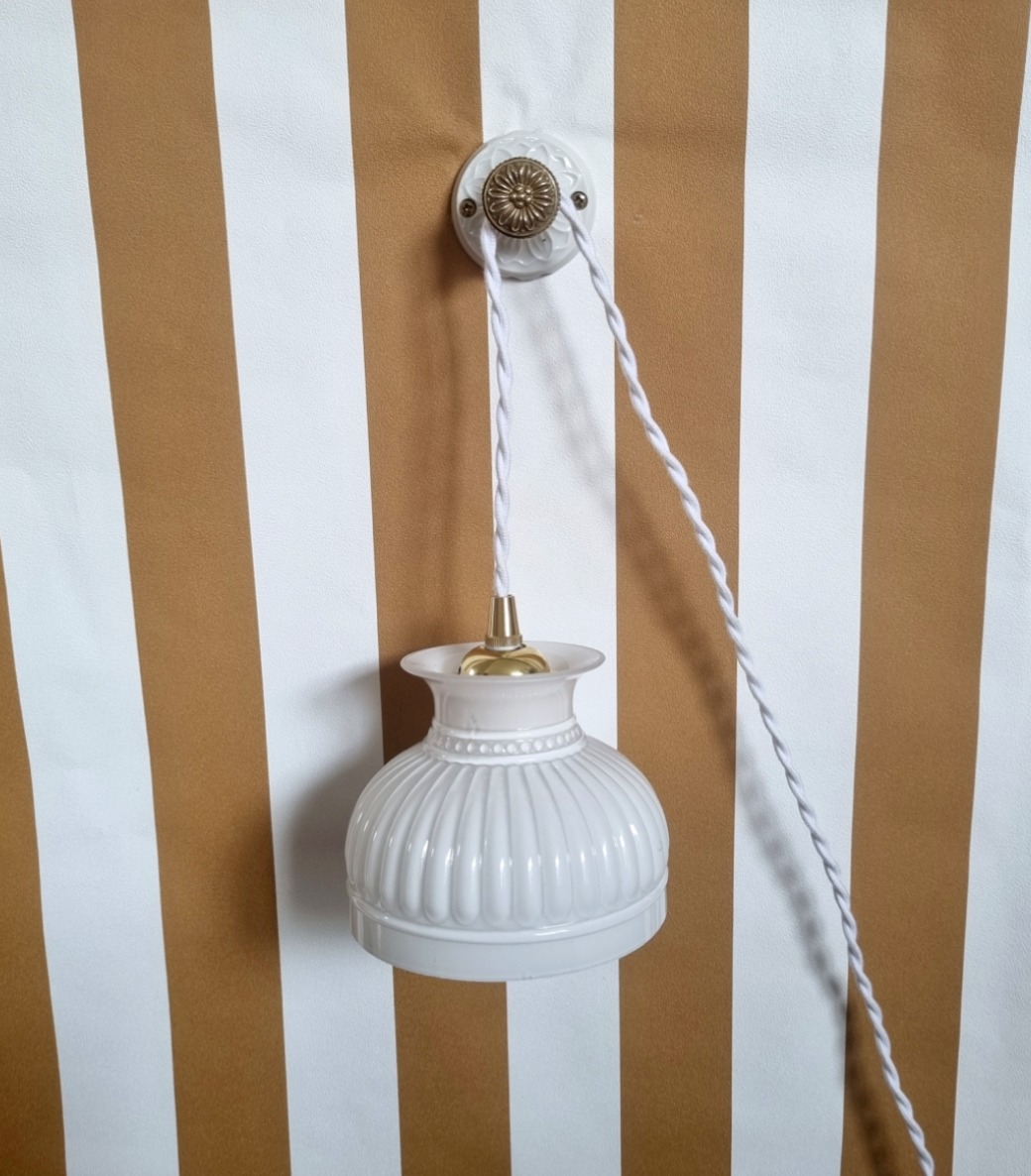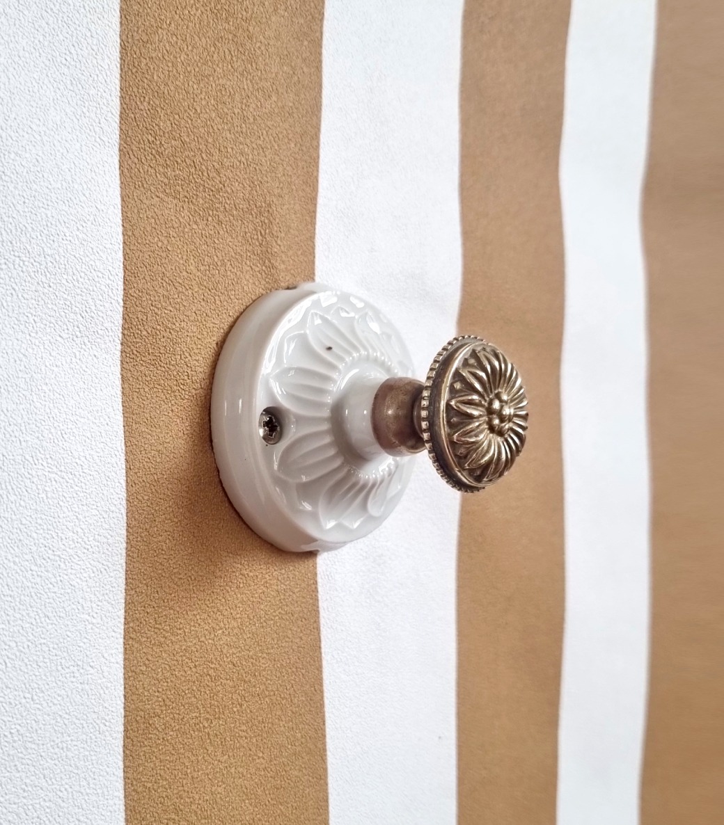Patère rosace en porcelaine et laiton pour suspendre votre lampe baladeuse le long d’un mur où vous souhaitez. Une création décorative et upcycling.