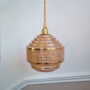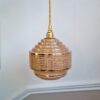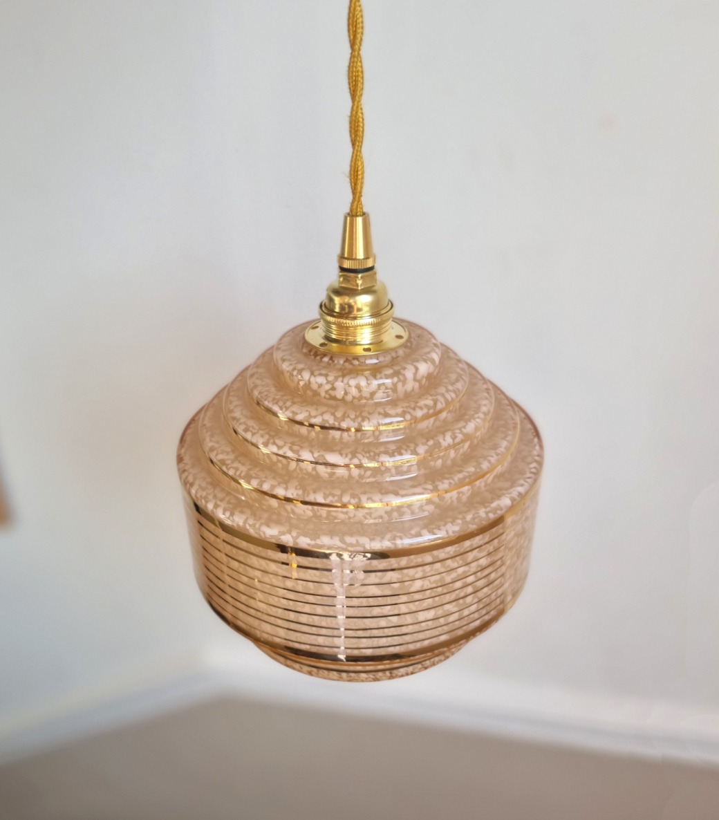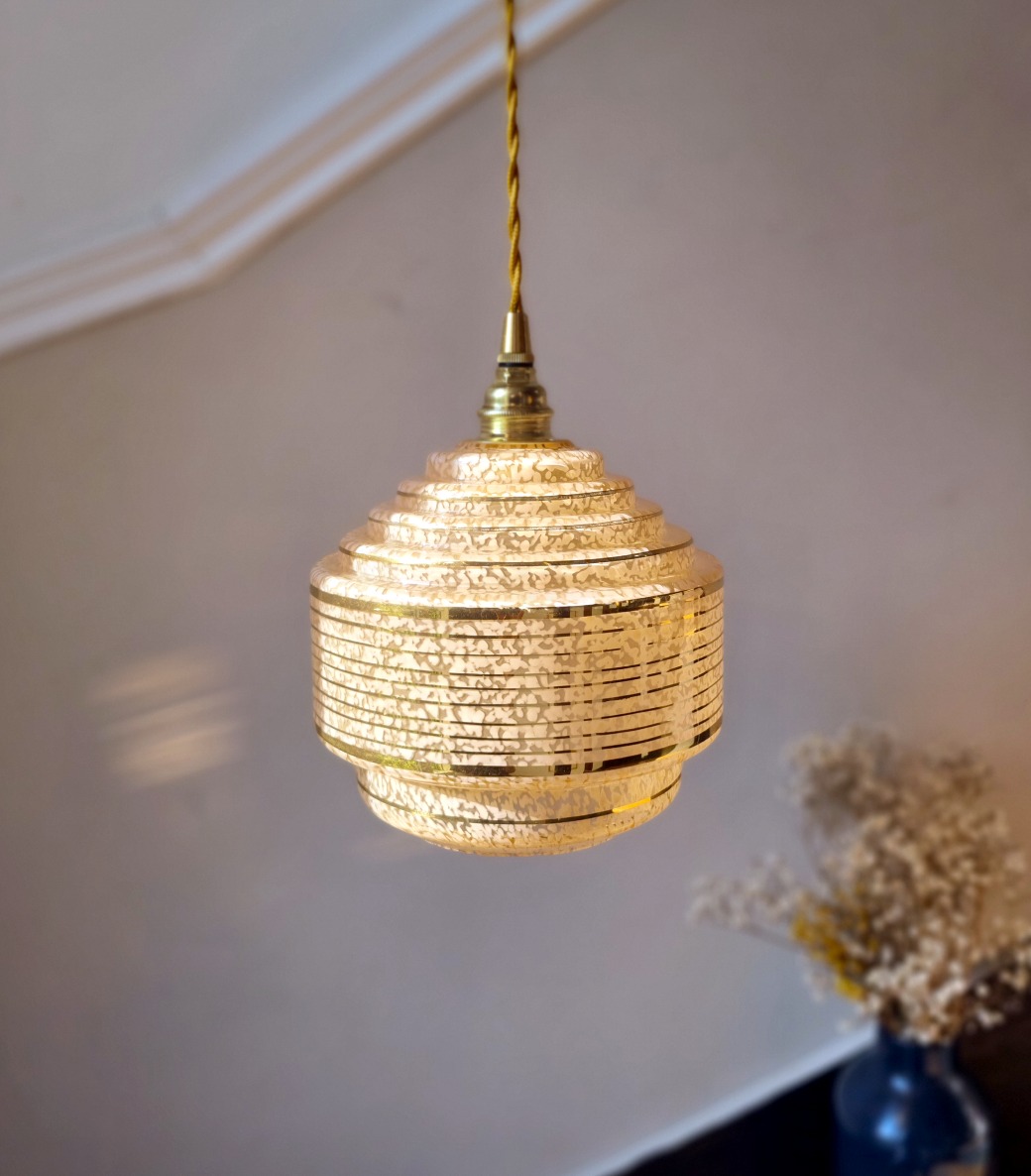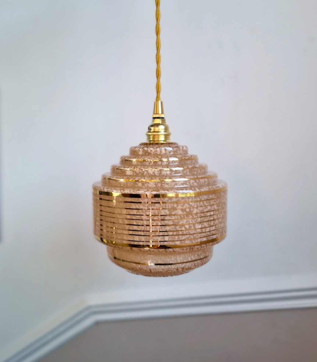 Magnifique suspension globe en verre de clichy moucheté rose, délicatement souligné de lignes dorées. Un luminaire vintage des années 1930 pour un intérieur unique, slow et poétique.