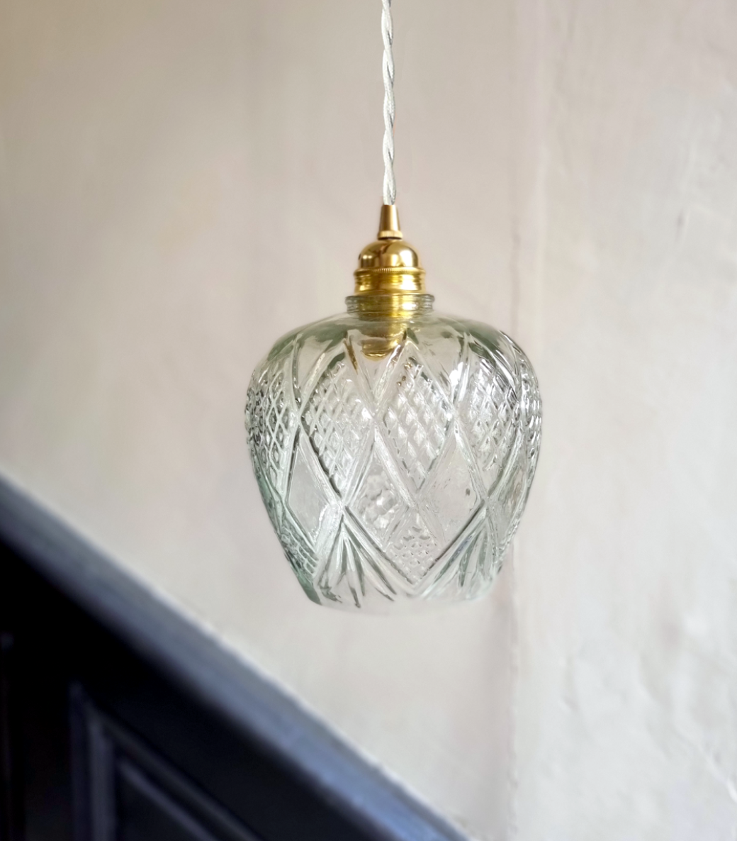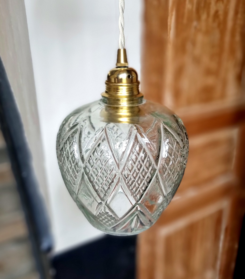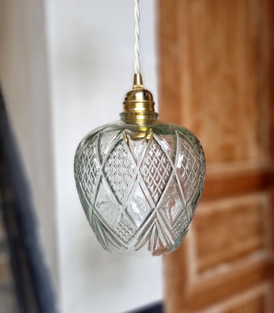 Suspension globe en verre transparent vintage des années 70. Un globe ciselé et élégant pour décorer et illuminer votre intérieur avec style !.