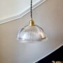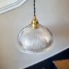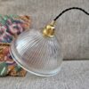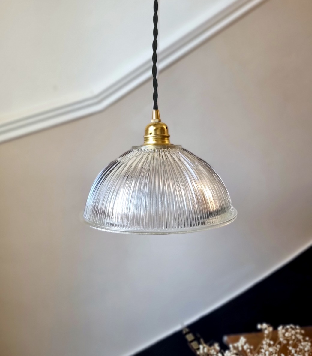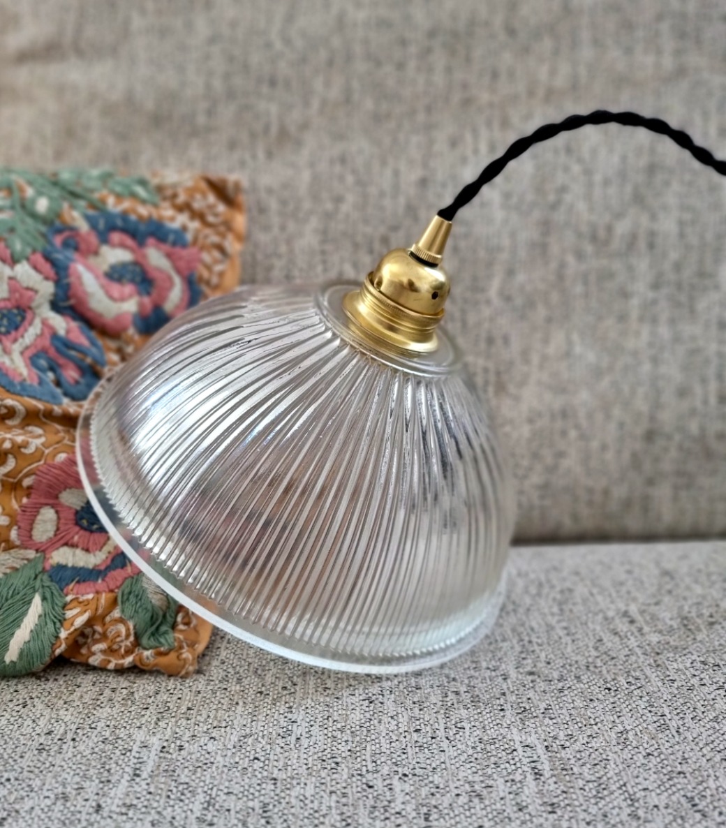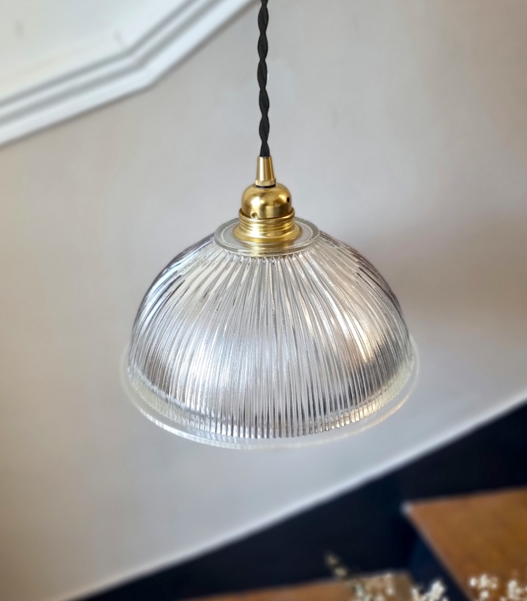 Suspension Holophane en verre prismatique. Elles trouvera très facilement sa place, au dessus d’une table de salle à manger, dans un couloir, une entrée. Avec ses stries et sa forme coupole, ce luminaire vintage Holophane diffusera une lumière chaleureuse, sublimée par les jeux d’ombre et de lumière créés par son verre prismatique.