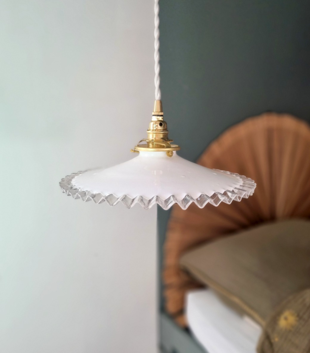 Elégante suspension en opaline blanche avec bord dentelé transparent. Un luminaire vintage, décoratif et intemporel pour illuminer votre intérieur avec style.